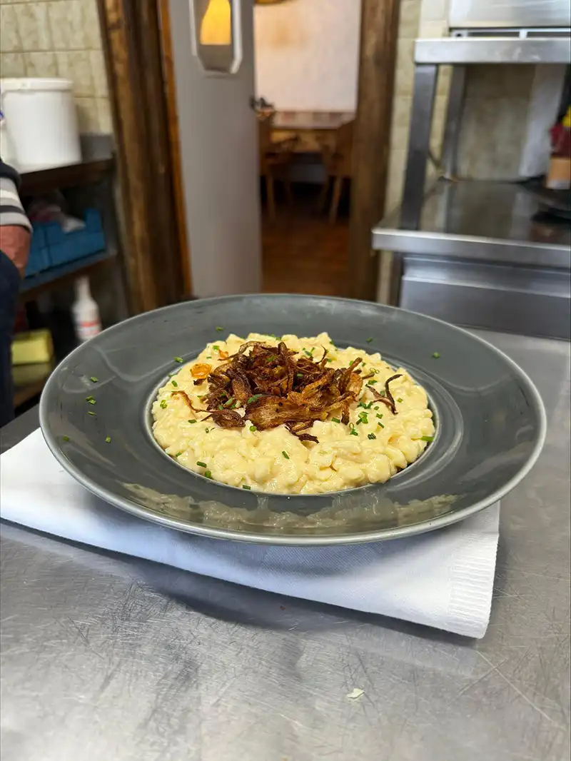 Tiroler Käsespätzle mit Röstzwiebel (A,C,G)