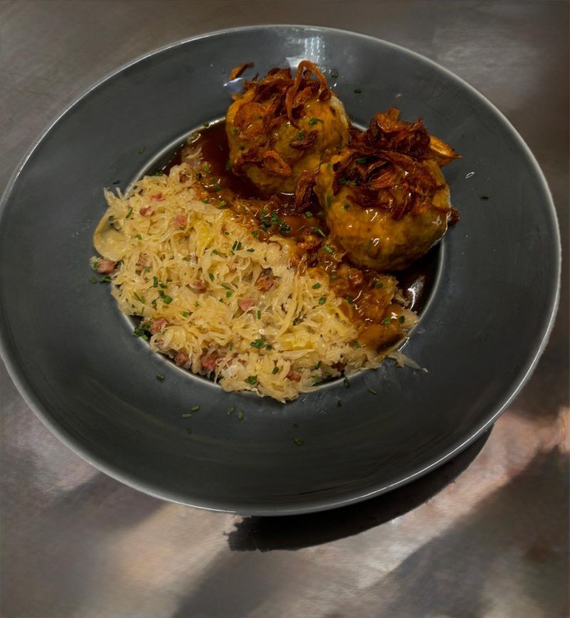 2 Speckknödel mit hausgemachtem Sauerkraut auf Bratensauce (A,C,G,O)